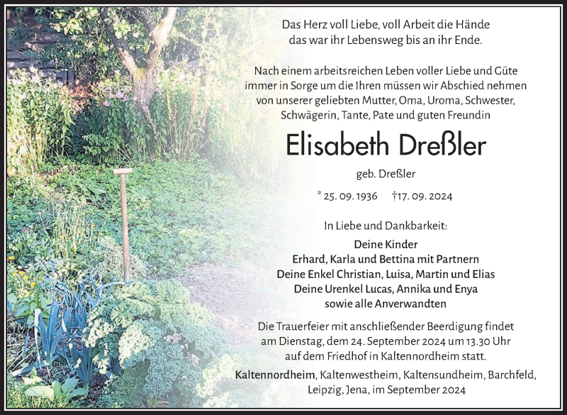 Hier finden Sie alle Traueranzeigen aus der Zeitung, die bisher für Elisabeth Dreßler erschienen sind. Weitere Traueranzeigen, die in der Zeitung erscheinen, werden hier ebenfalls aufgelistet