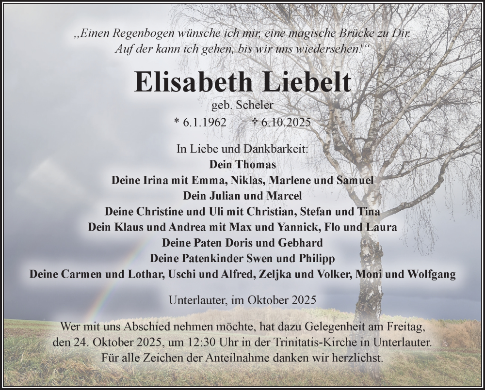 Hier finden Sie alle Traueranzeigen aus der Zeitung, die bisher für Elisabeth Liebelt erschienen sind. Weitere Traueranzeigen, die in der Zeitung erscheinen, werden hier ebenfalls aufgelistet