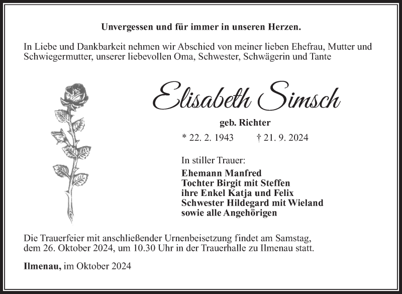 Hier finden Sie alle Traueranzeigen aus der Zeitung, die bisher für Elisabeth Simsch erschienen sind. Weitere Traueranzeigen, die in der Zeitung erscheinen, werden hier ebenfalls aufgelistet