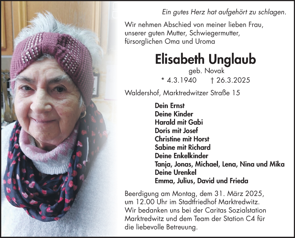 Hier finden Sie alle Traueranzeigen aus der Zeitung, die bisher für Elisabeth Unglaub erschienen sind. Weitere Traueranzeigen, die in der Zeitung erscheinen, werden hier ebenfalls aufgelistet