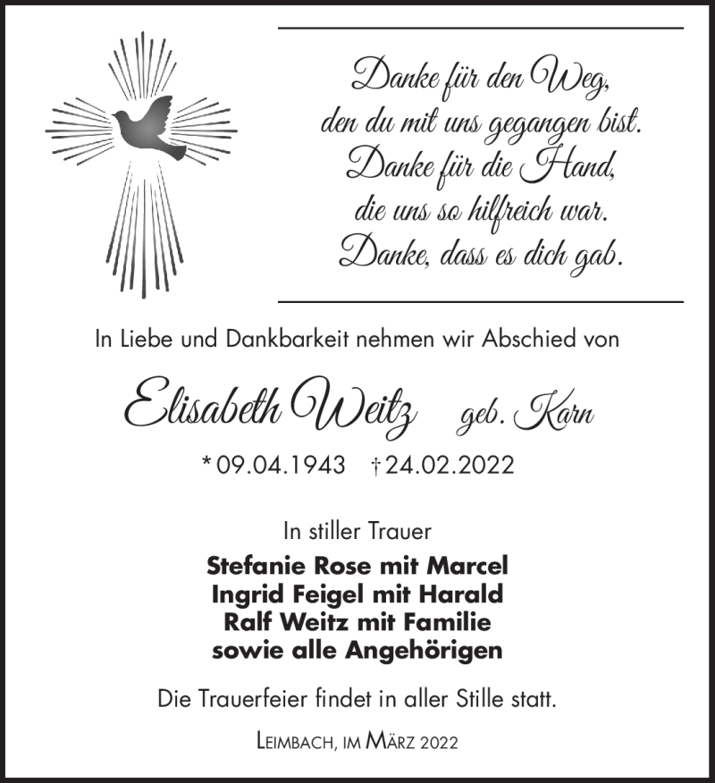 Hier finden Sie alle Traueranzeigen aus der Zeitung, die bisher für Elisabeth Weitz erschienen sind. Weitere Traueranzeigen, die in der Zeitung erscheinen, werden hier ebenfalls aufgelistet