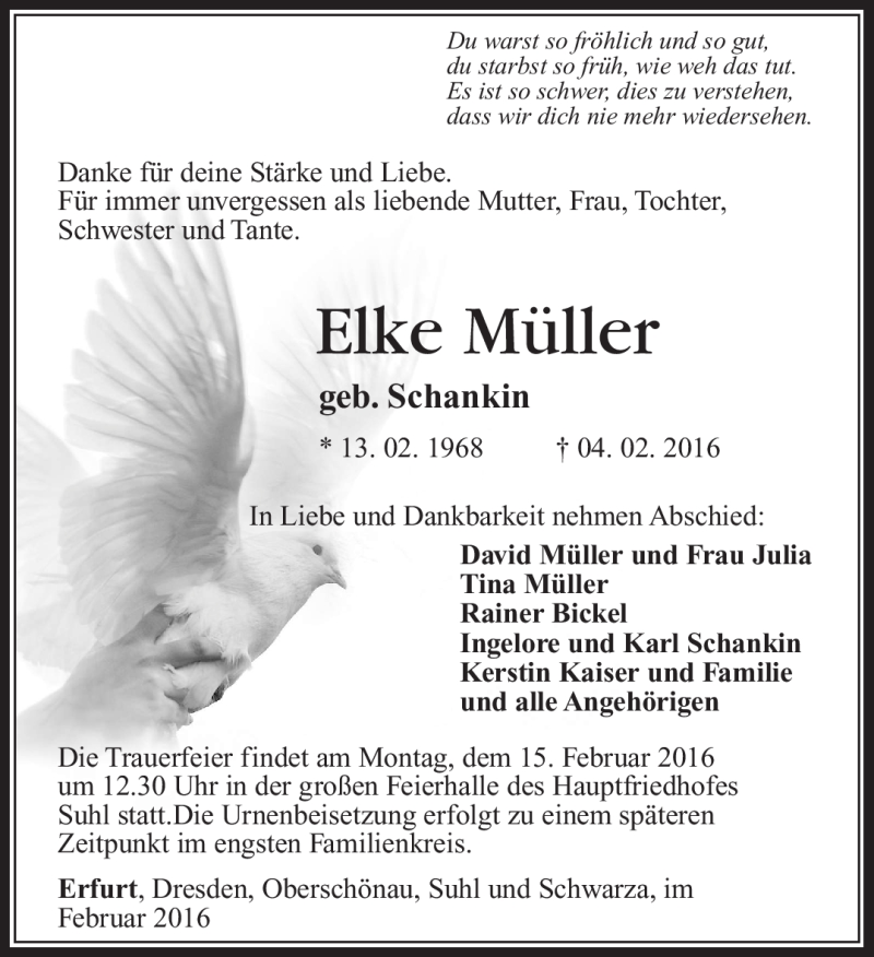 Hier finden Sie alle Traueranzeigen aus der Zeitung, die bisher für Elke Müller erschienen sind. Weitere Traueranzeigen, die in der Zeitung erscheinen, werden hier ebenfalls aufgelistet