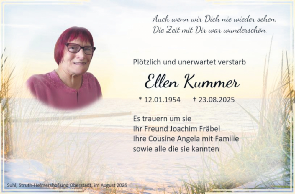 Hier finden Sie alle Traueranzeigen aus der Zeitung, die bisher für Ellen Kummer erschienen sind. Weitere Traueranzeigen, die in der Zeitung erscheinen, werden hier ebenfalls aufgelistet