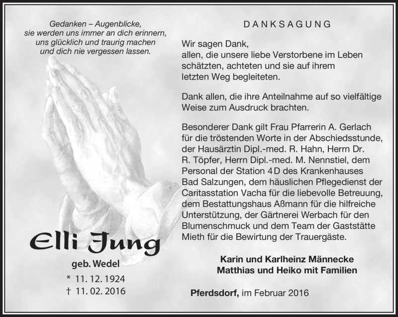 Hier finden Sie alle Traueranzeigen aus der Zeitung, die bisher für Elli Jung erschienen sind. Weitere Traueranzeigen, die in der Zeitung erscheinen, werden hier ebenfalls aufgelistet