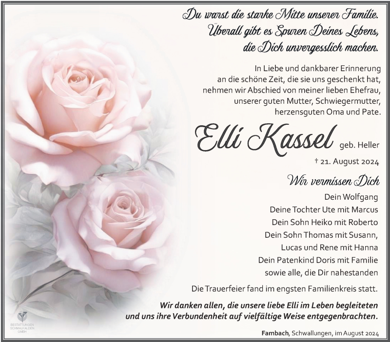 Hier finden Sie alle Traueranzeigen aus der Zeitung, die bisher für Elli Kassel erschienen sind. Weitere Traueranzeigen, die in der Zeitung erscheinen, werden hier ebenfalls aufgelistet