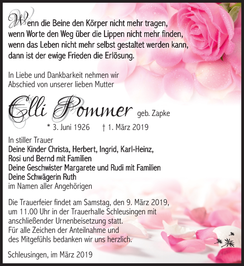 Hier finden Sie alle Traueranzeigen aus der Zeitung, die bisher für Elli Pommer erschienen sind. Weitere Traueranzeigen, die in der Zeitung erscheinen, werden hier ebenfalls aufgelistet