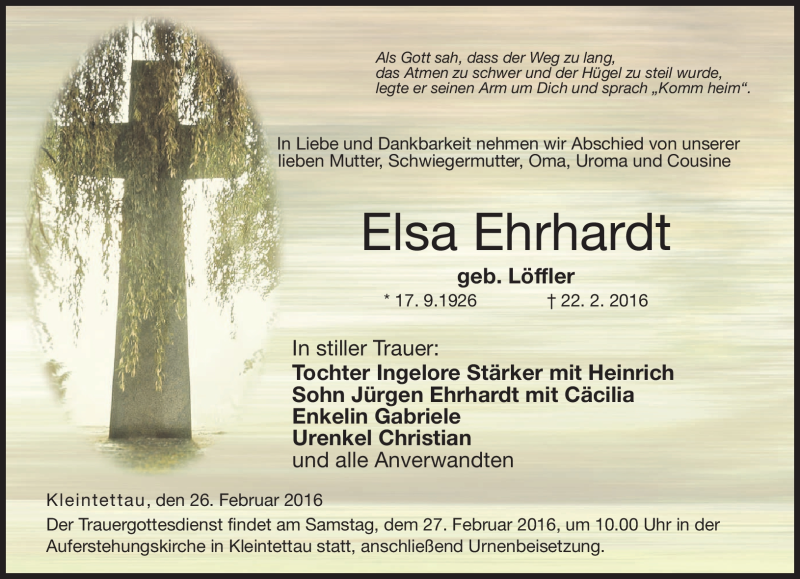 Hier finden Sie alle Traueranzeigen aus der Zeitung, die bisher für Elsa Ehrhardt erschienen sind. Weitere Traueranzeigen, die in der Zeitung erscheinen, werden hier ebenfalls aufgelistet