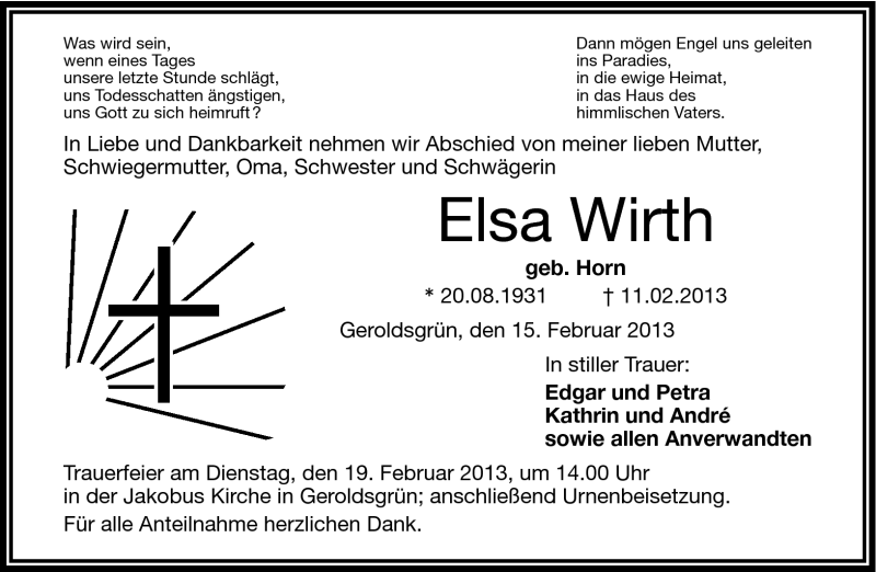 Hier finden Sie alle Traueranzeigen aus der Zeitung, die bisher für Elsa Wirth erschienen sind. Weitere Traueranzeigen, die in der Zeitung erscheinen, werden hier ebenfalls aufgelistet