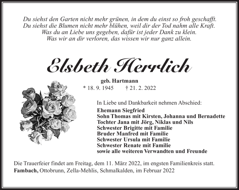Hier finden Sie alle Traueranzeigen aus der Zeitung, die bisher für Elsbeth Herrlich erschienen sind. Weitere Traueranzeigen, die in der Zeitung erscheinen, werden hier ebenfalls aufgelistet