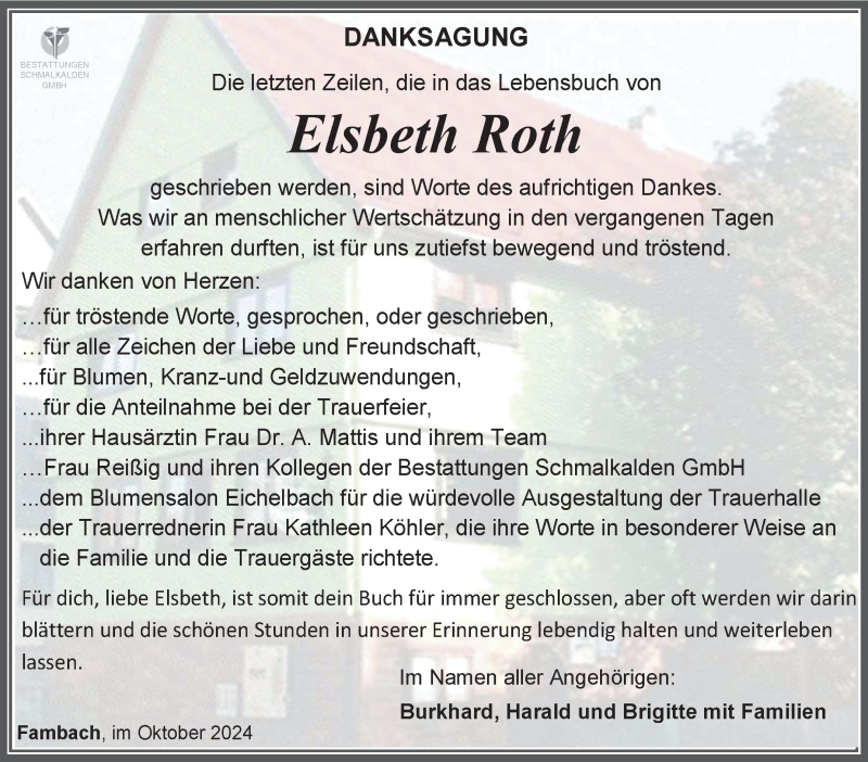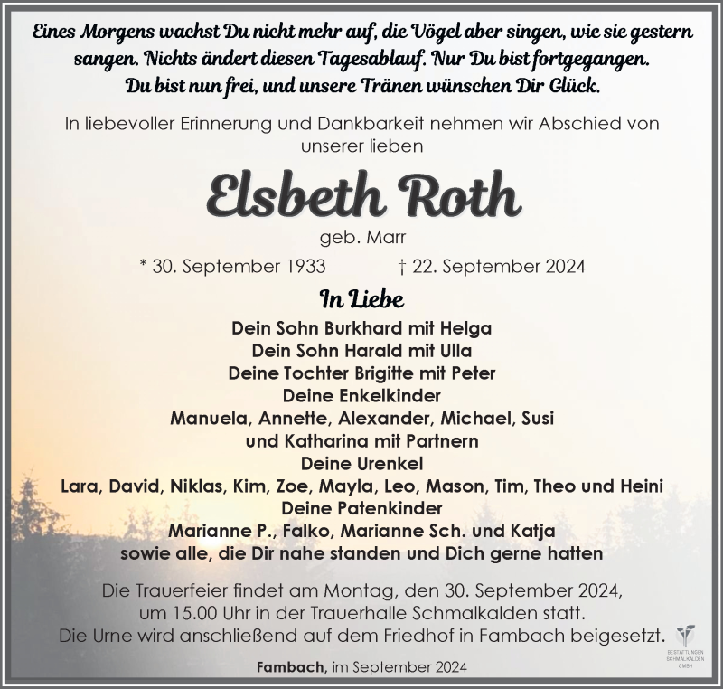 Hier finden Sie alle Traueranzeigen aus der Zeitung, die bisher für Elsbeth Roth erschienen sind. Weitere Traueranzeigen, die in der Zeitung erscheinen, werden hier ebenfalls aufgelistet
