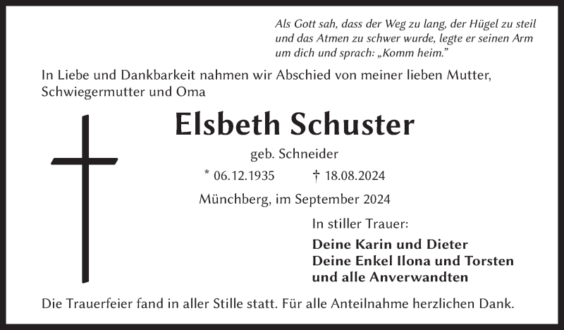Hier finden Sie alle Traueranzeigen aus der Zeitung, die bisher für Elsbeth Schuster erschienen sind. Weitere Traueranzeigen, die in der Zeitung erscheinen, werden hier ebenfalls aufgelistet