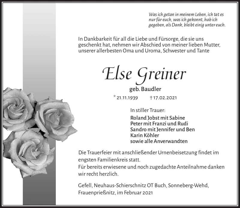 Hier finden Sie alle Traueranzeigen aus der Zeitung, die bisher für Else Greiner erschienen sind. Weitere Traueranzeigen, die in der Zeitung erscheinen, werden hier ebenfalls aufgelistet