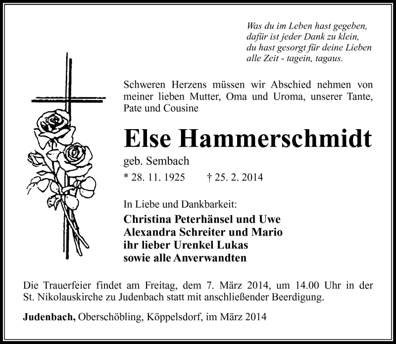 Hier finden Sie alle Traueranzeigen aus der Zeitung, die bisher für Else Hammerschmidt erschienen sind. Weitere Traueranzeigen, die in der Zeitung erscheinen, werden hier ebenfalls aufgelistet