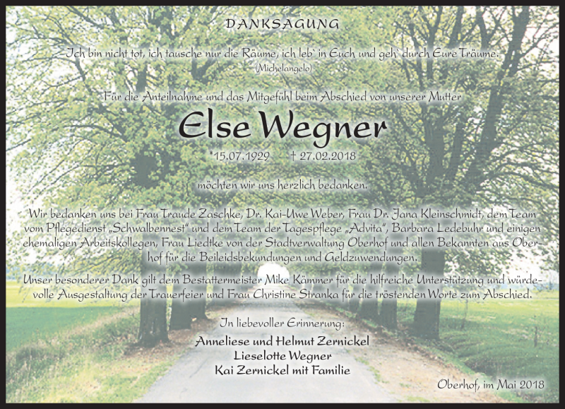 Hier finden Sie alle Traueranzeigen aus der Zeitung, die bisher für Else Wegner erschienen sind. Weitere Traueranzeigen, die in der Zeitung erscheinen, werden hier ebenfalls aufgelistet