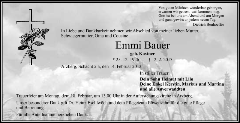 Hier finden Sie alle Traueranzeigen aus der Zeitung, die bisher für Emmi Bauer erschienen sind. Weitere Traueranzeigen, die in der Zeitung erscheinen, werden hier ebenfalls aufgelistet