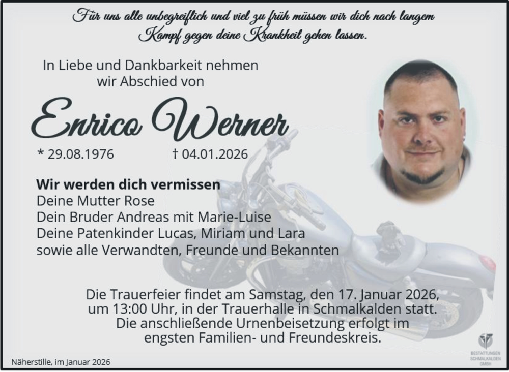Hier finden Sie alle Traueranzeigen aus der Zeitung, die bisher für Enrico Werner erschienen sind. Weitere Traueranzeigen, die in der Zeitung erscheinen, werden hier ebenfalls aufgelistet