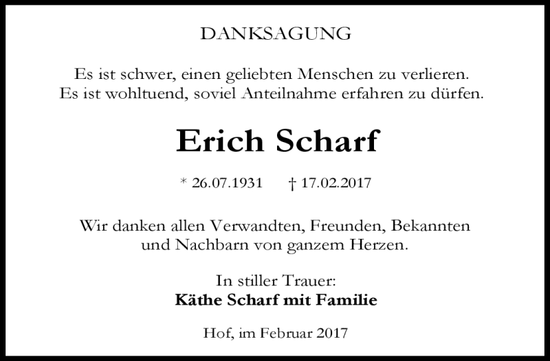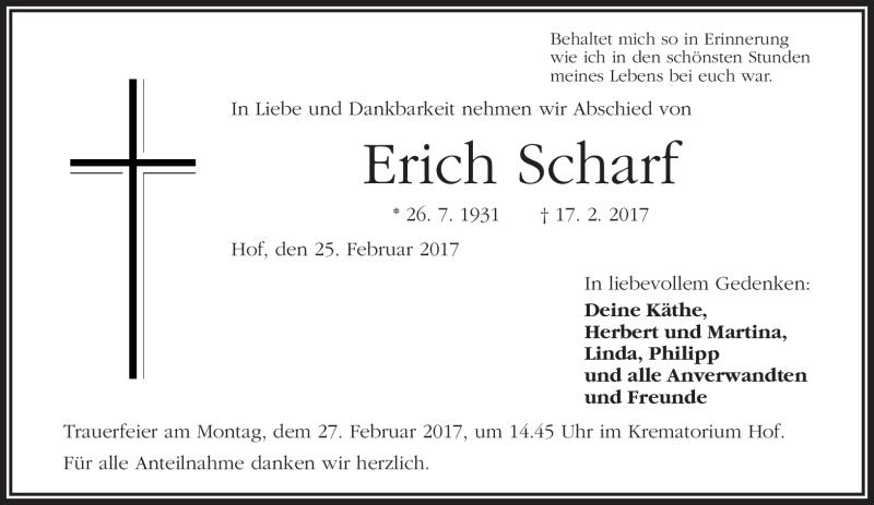 Hier finden Sie alle Traueranzeigen aus der Zeitung, die bisher für Erich Scharf erschienen sind. Weitere Traueranzeigen, die in der Zeitung erscheinen, werden hier ebenfalls aufgelistet