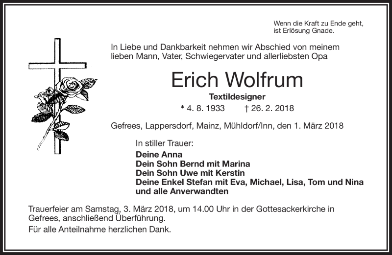 Hier finden Sie alle Traueranzeigen aus der Zeitung, die bisher für Erich Wolfrum erschienen sind. Weitere Traueranzeigen, die in der Zeitung erscheinen, werden hier ebenfalls aufgelistet