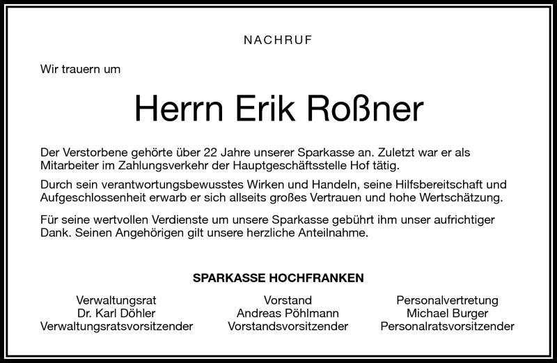 Hier finden Sie alle Traueranzeigen aus der Zeitung, die bisher für Erik Roßner erschienen sind. Weitere Traueranzeigen, die in der Zeitung erscheinen, werden hier ebenfalls aufgelistet