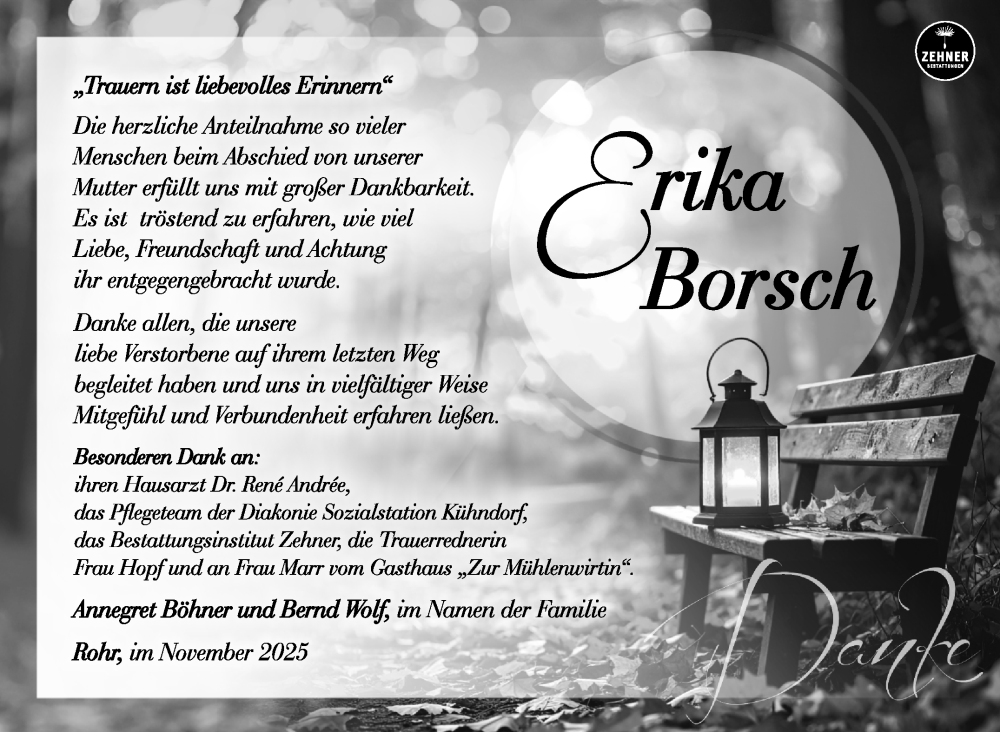 Hier finden Sie alle Traueranzeigen aus der Zeitung, die bisher für Erika Borsch erschienen sind. Weitere Traueranzeigen, die in der Zeitung erscheinen, werden hier ebenfalls aufgelistet