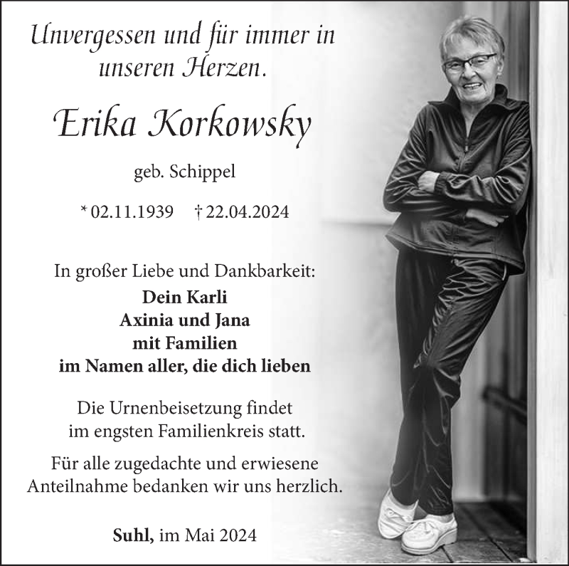 Hier finden Sie alle Traueranzeigen aus der Zeitung, die bisher für Erika Korkowsky erschienen sind. Weitere Traueranzeigen, die in der Zeitung erscheinen, werden hier ebenfalls aufgelistet