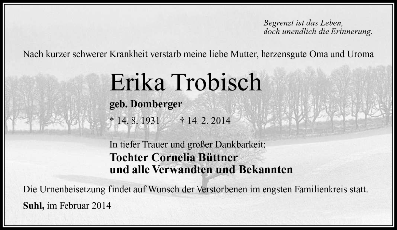 Hier finden Sie alle Traueranzeigen aus der Zeitung, die bisher für Erika Trobisch erschienen sind. Weitere Traueranzeigen, die in der Zeitung erscheinen, werden hier ebenfalls aufgelistet