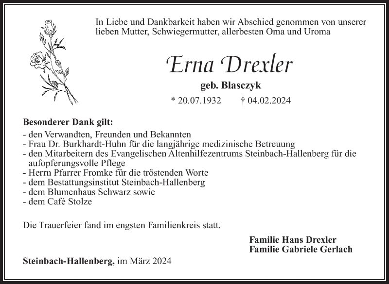 Hier finden Sie alle Traueranzeigen aus der Zeitung, die bisher für Erna Drexler erschienen sind. Weitere Traueranzeigen, die in der Zeitung erscheinen, werden hier ebenfalls aufgelistet