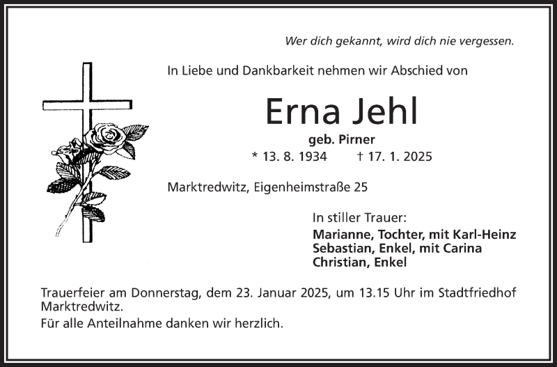 Hier finden Sie alle Traueranzeigen aus der Zeitung, die bisher für Erna Jehl erschienen sind. Weitere Traueranzeigen, die in der Zeitung erscheinen, werden hier ebenfalls aufgelistet