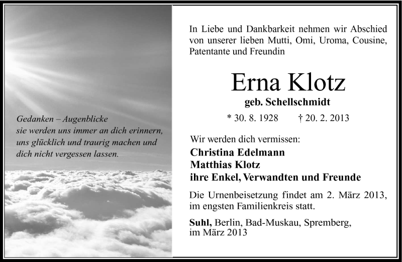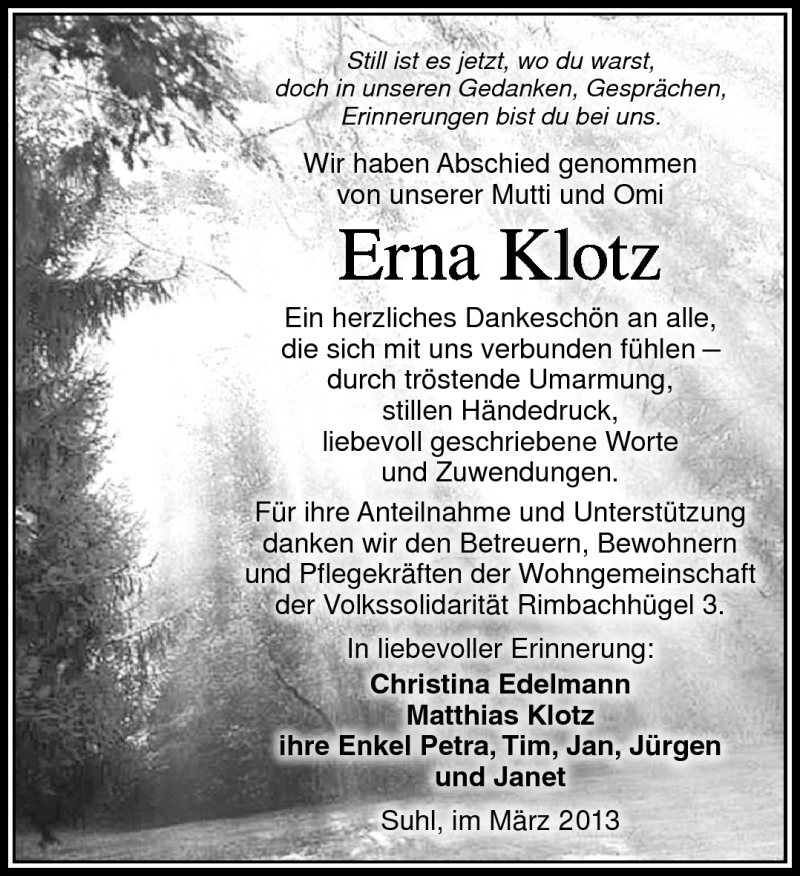 Hier finden Sie alle Traueranzeigen aus der Zeitung, die bisher für Erna Klotz erschienen sind. Weitere Traueranzeigen, die in der Zeitung erscheinen, werden hier ebenfalls aufgelistet