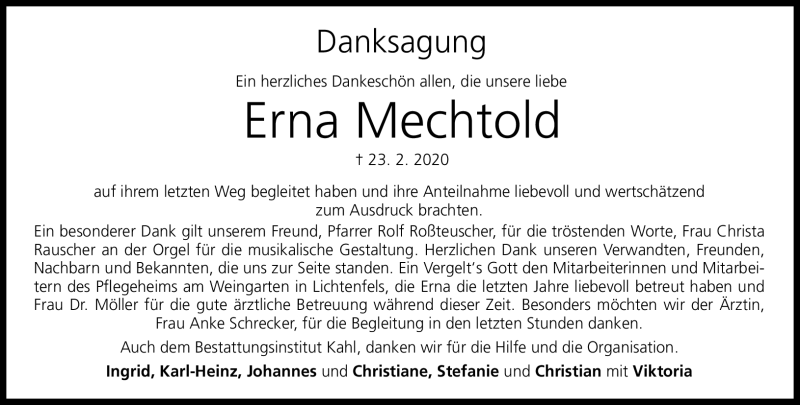 Hier finden Sie alle Traueranzeigen aus der Zeitung, die bisher für Erna Mechtold erschienen sind. Weitere Traueranzeigen, die in der Zeitung erscheinen, werden hier ebenfalls aufgelistet