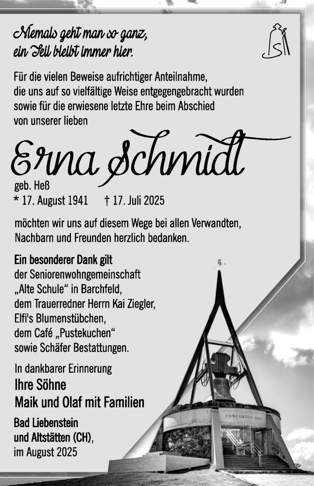 Hier finden Sie alle Traueranzeigen aus der Zeitung, die bisher für Erna Schmidt erschienen sind. Weitere Traueranzeigen, die in der Zeitung erscheinen, werden hier ebenfalls aufgelistet