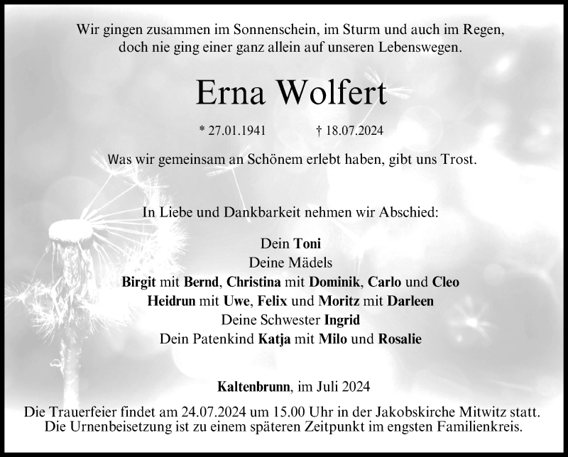 Hier finden Sie alle Traueranzeigen aus der Zeitung, die bisher für Erna Wolfert erschienen sind. Weitere Traueranzeigen, die in der Zeitung erscheinen, werden hier ebenfalls aufgelistet