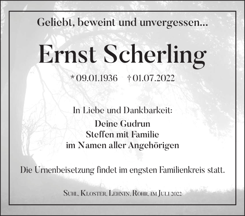 Hier finden Sie alle Traueranzeigen aus der Zeitung, die bisher für Ernst Scherling erschienen sind. Weitere Traueranzeigen, die in der Zeitung erscheinen, werden hier ebenfalls aufgelistet
