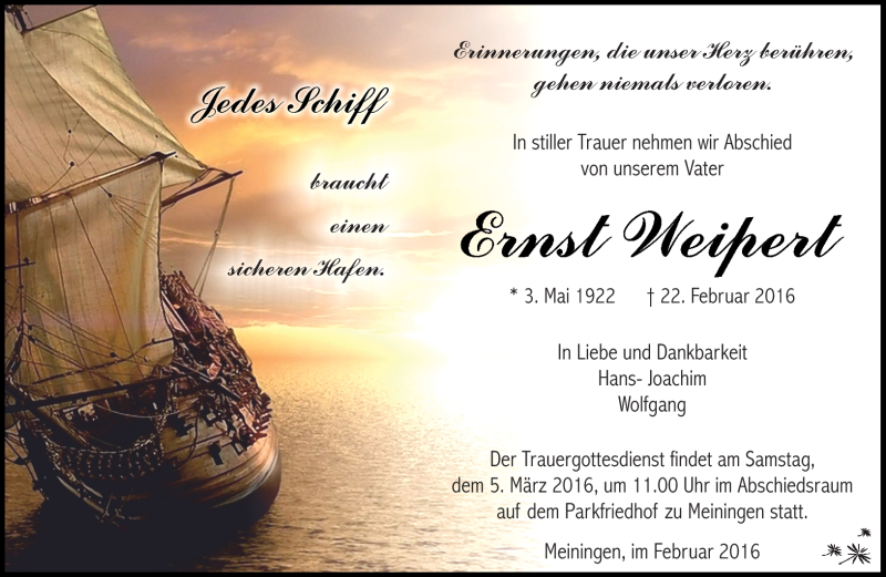 Hier finden Sie alle Traueranzeigen aus der Zeitung, die bisher für Ernst Weipert erschienen sind. Weitere Traueranzeigen, die in der Zeitung erscheinen, werden hier ebenfalls aufgelistet