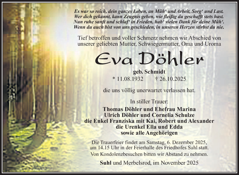 Hier finden Sie alle Traueranzeigen aus der Zeitung, die bisher für Eva Döhler erschienen sind. Weitere Traueranzeigen, die in der Zeitung erscheinen, werden hier ebenfalls aufgelistet