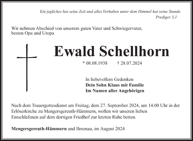 Hier finden Sie alle Traueranzeigen aus der Zeitung, die bisher für Ewald Schellhorn erschienen sind. Weitere Traueranzeigen, die in der Zeitung erscheinen, werden hier ebenfalls aufgelistet