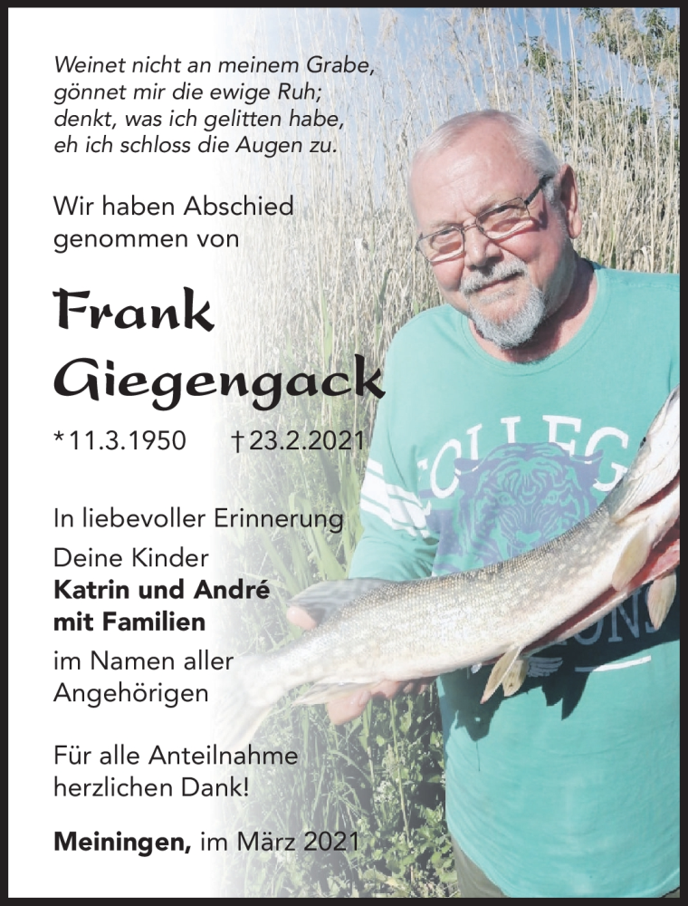 Hier finden Sie alle Traueranzeigen aus der Zeitung, die bisher für Frank Giegengack erschienen sind. Weitere Traueranzeigen, die in der Zeitung erscheinen, werden hier ebenfalls aufgelistet