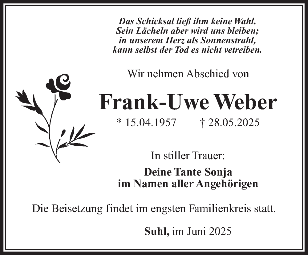 Hier finden Sie alle Traueranzeigen aus der Zeitung, die bisher für Frank-Uwe Weber erschienen sind. Weitere Traueranzeigen, die in der Zeitung erscheinen, werden hier ebenfalls aufgelistet