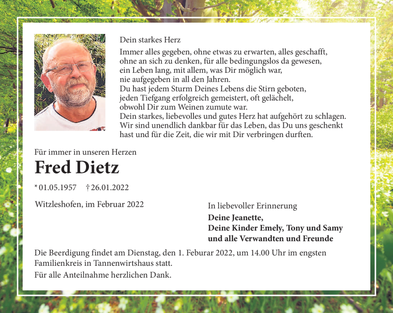 Hier finden Sie alle Traueranzeigen aus der Zeitung, die bisher für Fred Dietz erschienen sind. Weitere Traueranzeigen, die in der Zeitung erscheinen, werden hier ebenfalls aufgelistet