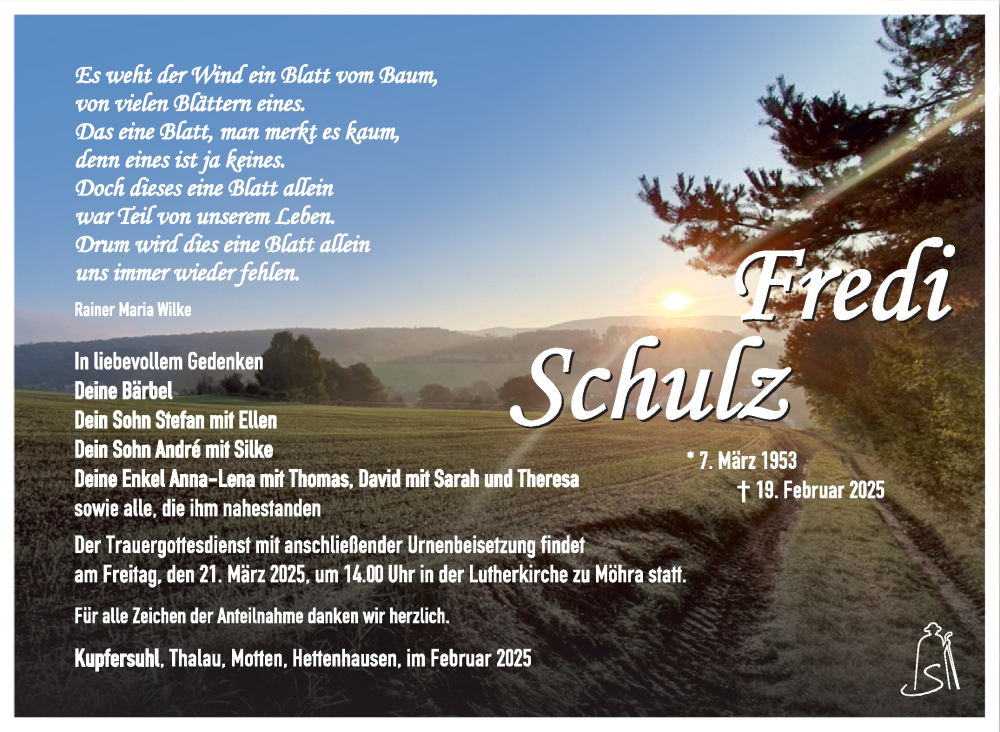 Hier finden Sie alle Traueranzeigen aus der Zeitung, die bisher für Fredi Schulz erschienen sind. Weitere Traueranzeigen, die in der Zeitung erscheinen, werden hier ebenfalls aufgelistet