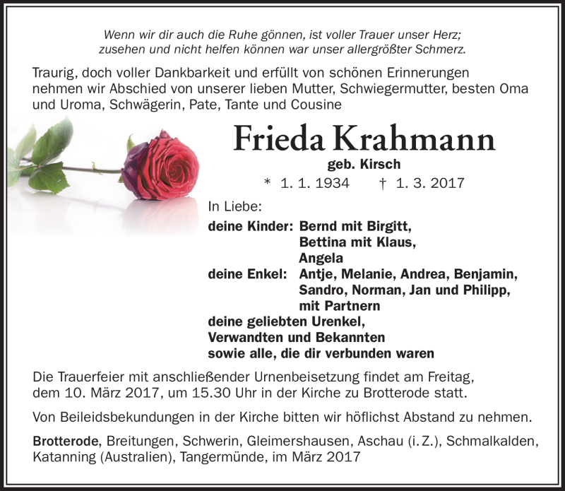 Hier finden Sie alle Traueranzeigen aus der Zeitung, die bisher für Frieda Krahmann erschienen sind. Weitere Traueranzeigen, die in der Zeitung erscheinen, werden hier ebenfalls aufgelistet