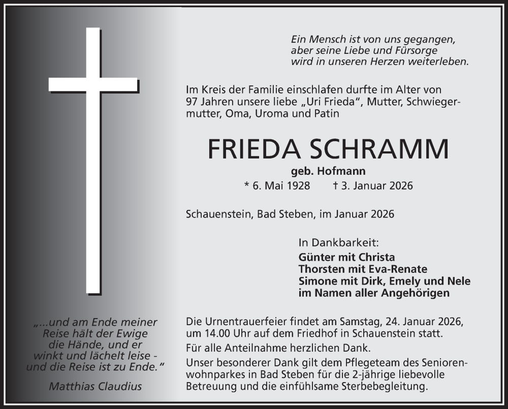 Hier finden Sie alle Traueranzeigen aus der Zeitung, die bisher für Frieda Schramm erschienen sind. Weitere Traueranzeigen, die in der Zeitung erscheinen, werden hier ebenfalls aufgelistet
