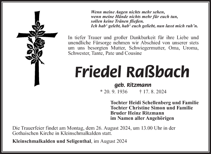 Hier finden Sie alle Traueranzeigen aus der Zeitung, die bisher für Friedel Raßbach erschienen sind. Weitere Traueranzeigen, die in der Zeitung erscheinen, werden hier ebenfalls aufgelistet
