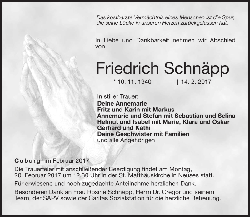 Hier finden Sie alle Traueranzeigen aus der Zeitung, die bisher für Friedrich Schnäpp erschienen sind. Weitere Traueranzeigen, die in der Zeitung erscheinen, werden hier ebenfalls aufgelistet