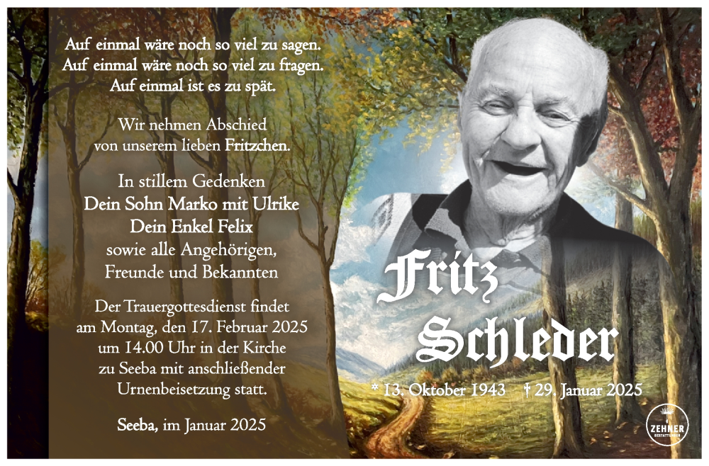 Hier finden Sie alle Traueranzeigen aus der Zeitung, die bisher für Fritz Schleder erschienen sind. Weitere Traueranzeigen, die in der Zeitung erscheinen, werden hier ebenfalls aufgelistet