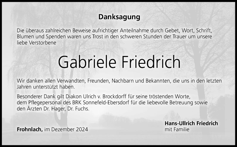 Hier finden Sie alle Traueranzeigen aus der Zeitung, die bisher für Gabriele Friedrich erschienen sind. Weitere Traueranzeigen, die in der Zeitung erscheinen, werden hier ebenfalls aufgelistet