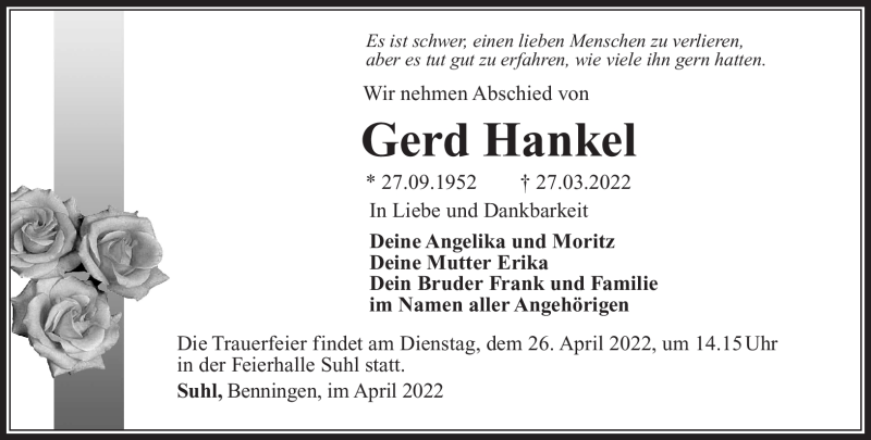 Hier finden Sie alle Traueranzeigen aus der Zeitung, die bisher für Gerd Hankel erschienen sind. Weitere Traueranzeigen, die in der Zeitung erscheinen, werden hier ebenfalls aufgelistet