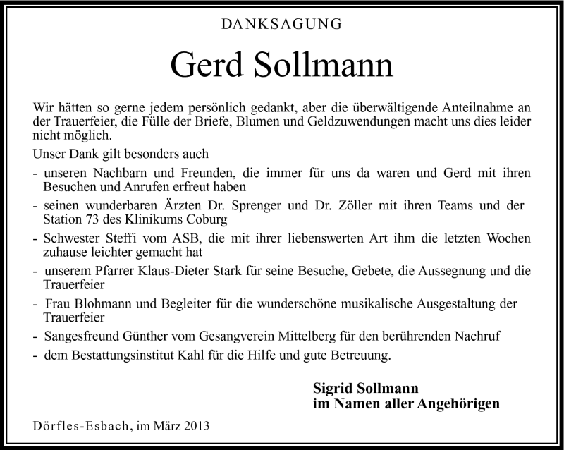 Hier finden Sie alle Traueranzeigen aus der Zeitung, die bisher für Gerd Sollmann erschienen sind. Weitere Traueranzeigen, die in der Zeitung erscheinen, werden hier ebenfalls aufgelistet