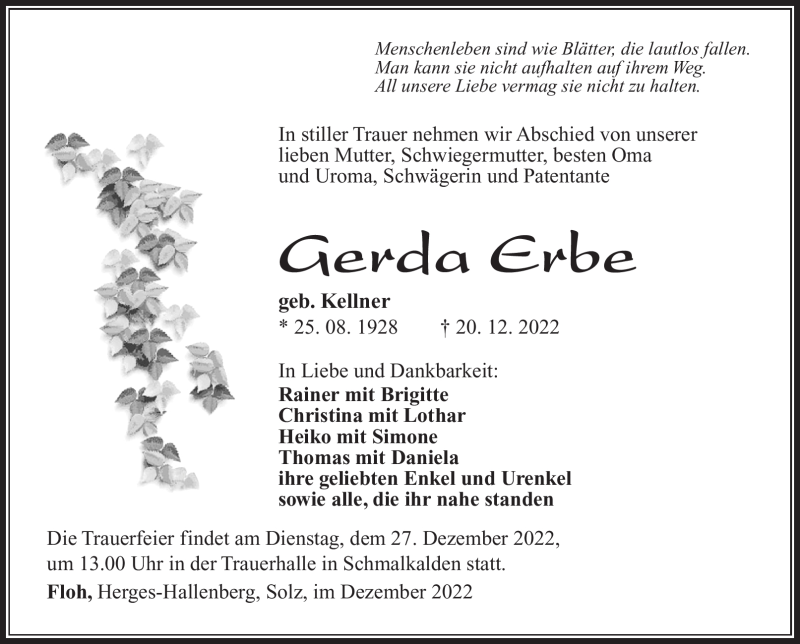 Hier finden Sie alle Traueranzeigen aus der Zeitung, die bisher für Gerda Erbe erschienen sind. Weitere Traueranzeigen, die in der Zeitung erscheinen, werden hier ebenfalls aufgelistet
