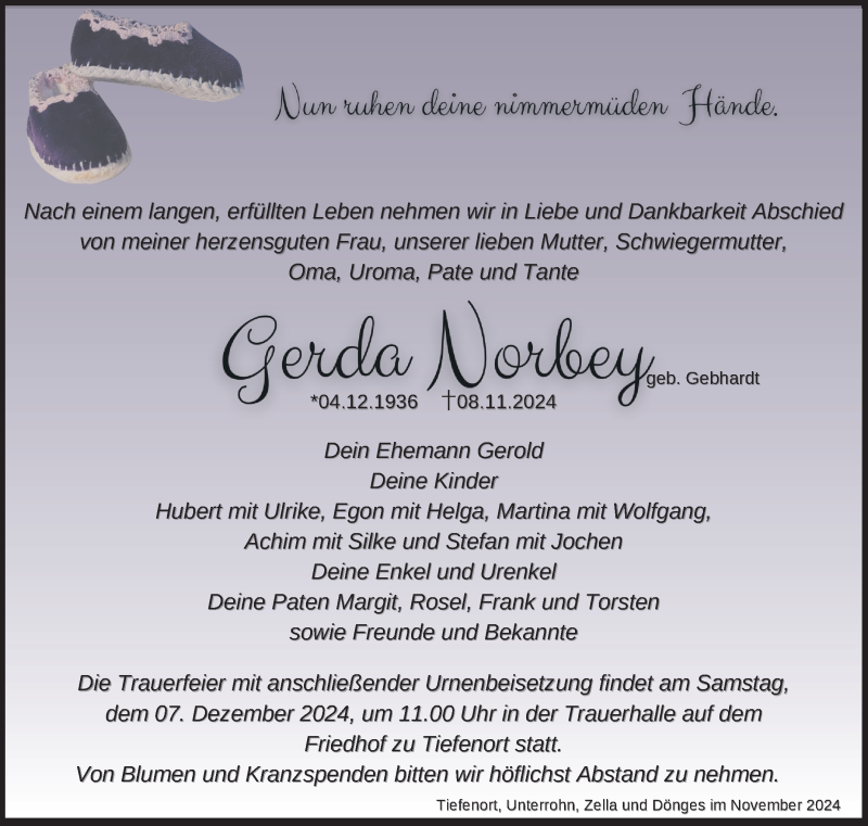 Hier finden Sie alle Traueranzeigen aus der Zeitung, die bisher für Gerda Norbey erschienen sind. Weitere Traueranzeigen, die in der Zeitung erscheinen, werden hier ebenfalls aufgelistet